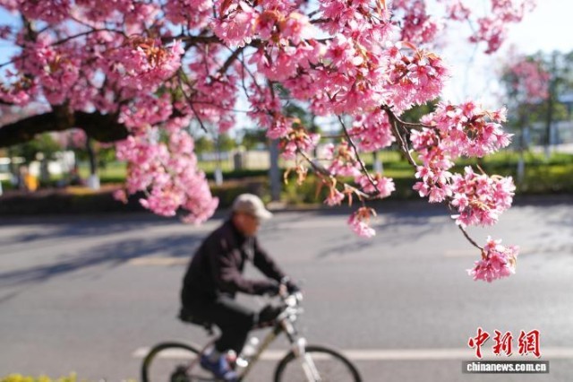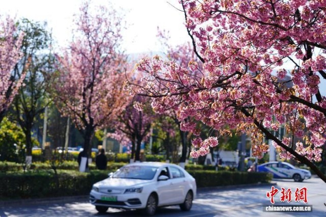 12月29日,昆明街头盛开的冬樱花。近日,云南昆明冬樱花盛开,勾勒出独属“春城”的冬日画卷。中新社记者 刘冉阳 摄