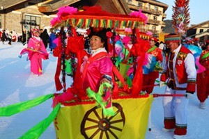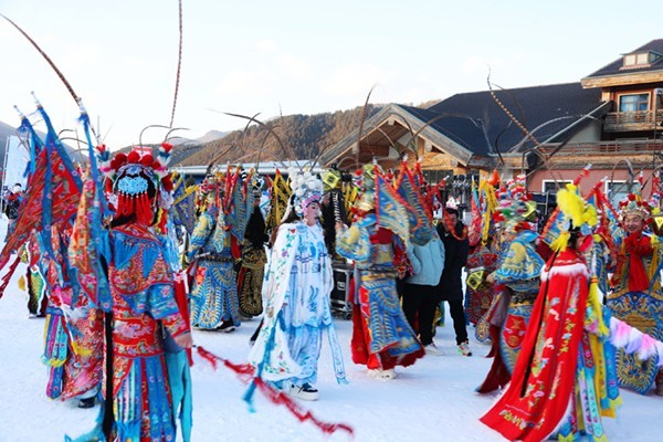 冬阳送暖,滑雪场开阔的雪地上聚起攒动的人群。一阵唢呐声撞破寒风,一支色彩浓烈的队伍从雪道旁的木屋后转出:打头的队员顶着插满绒球的花冠,大红色绸衫缀着金色团龙纹样,玫粉色披风随步伐扬起弧线,翠绿绸带与明黄折扇在雪地里划出鲜活的色彩——这是当地的秧歌队,队员们踩着“十字步”,把雪粒踩得簌簌作响。