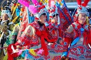 队伍里藏着不少“巧思”:有人套着黑绒毛驴道具,红绸扎起的驴耳随步伐一颠一颠,活像真驴撒欢;有人扮作《西游记》师徒四人,孙悟空的凤翅紫金冠沾了雪粒仍耀着金光,猪八戒的钉耙上还系了个红绒球;花车摇摇晃晃,车檐挂着彩条与铃铛,车上演员甩着水袖,和拉车队员一唱一和,惹得围观孩子扒着家长肩膀笑出了声。