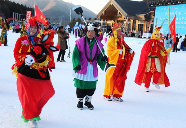 雪场游客也被这热闹裹了进去:穿滑雪服的年轻人举着手机跟在队伍旁拍摄,抱孩子的家长教孩子跟着拍手,连滑雪场工作人员都趁着换班间隙凑过来,录下猪八戒“拱雪”的憨态。“本来是来滑雪的,没想到赶上这么热闹的迎新活动,年味儿一下就浓了!”从北京来的游客李女士说,她怀里的孩子正扯着袖子,要去摸毛驴道具的耳朵。