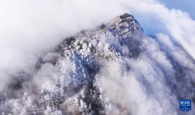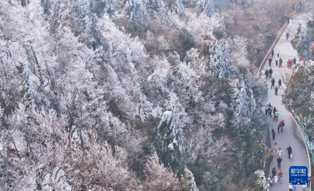 连日来,湖南省衡阳市南岳衡山风景区出现雾凇云海景观,壮美如画的景色吸引众多游客前来观赏游玩。