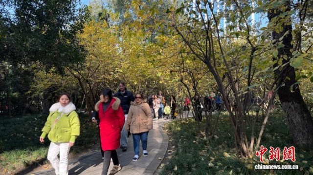 图为游人正在成都市人民公园内蜡梅盛放的小径中漫步赏景。杨予頔 摄