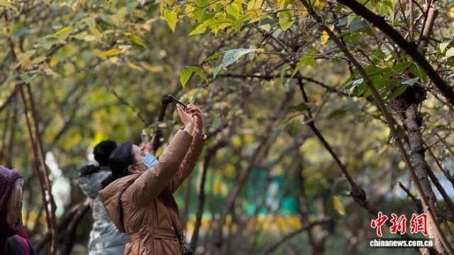 图为游人正在成都市人民公园内蜡梅盛放的小径中拍照打卡。杨予頔 摄