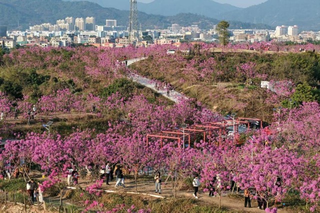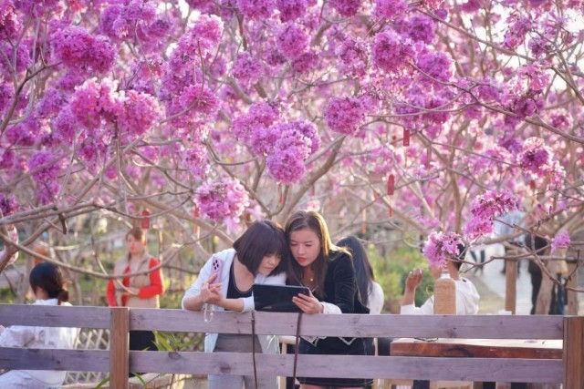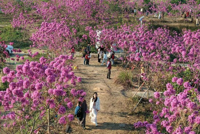 据悉,下庄里紫花风铃木园区由闲置果园改造而成,目前已种植7000余株紫花风铃木,经过几年的精心培育,现已成为远近闻名的休闲旅游打卡地。种植户老黄介绍,紫花风铃木的花期在每年的1—3月,按照规划,接下来将以这片花海为核心,扩大种植规模,打造一个集花文化节、研学基地、特色花食、康养空间等于一体的“花主题”美丽乡村,进而带动整片区域的经济发展。