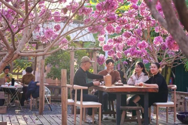 游客在紫花风铃木花海中泡茶,享受午后时光。(庄莉红 摄)