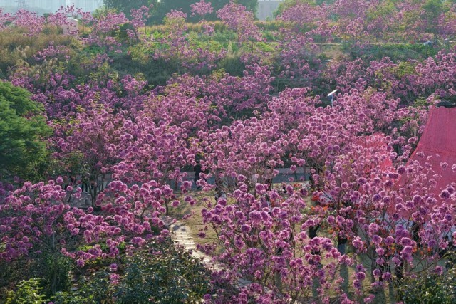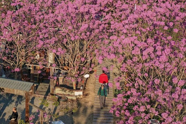 正午时分,记者沿着台阶漫步花海,途中盛放的紫花风铃木夹道,空气中花香弥漫,令人迷醉……冬日暖阳下,大片大片的紫花风铃木竞相绽放,一串串风铃状花朵抱团挂满枝头。从高处望去,山坡上犹如铺开粉紫绒毯,层层叠叠的花浪随风涌动,分外妖娆。
