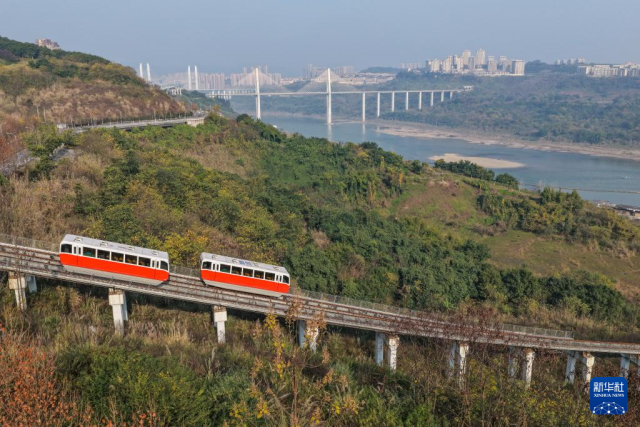 1月6日,在重庆市两江新区,游客搭乘时光缆车往返滨江休闲区和礼嘉智慧公园(无人机照片)。