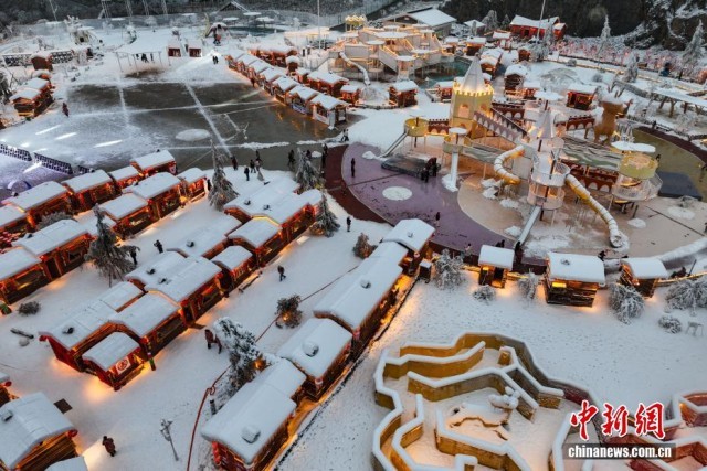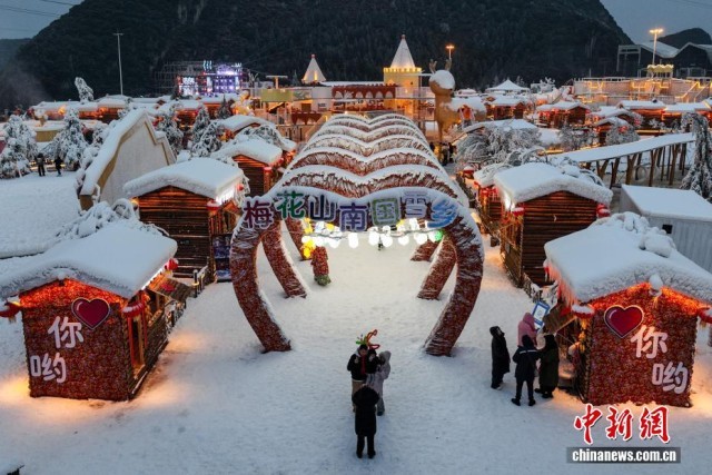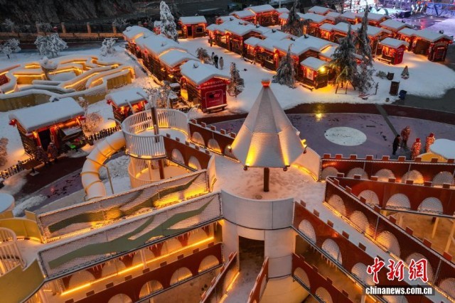 1月7日晚,游客在贵州省六盘水市钟山区“南国雪乡”项目内游玩。该项目由钟山区梅花山旅游景区凭借梅花山滑雪场的核心优势,以“厚雪压木屋、红灯映炊烟”为设计理念打造,旨在让南方游客无需北上即可邂逅地道雪乡风情,打造沉浸式文旅新体验。