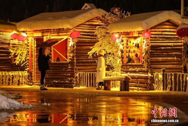 1月7日晚,游客在贵州省六盘水市钟山区“南国雪乡”项目内拍照。该项目由钟山区梅花山旅游景区凭借梅花山滑雪场的核心优势,以“厚雪压木屋、红灯映炊烟”为设计理念打造,旨在让南方游客无需北上即可邂逅地道雪乡风情,打造沉浸式文旅新体验。