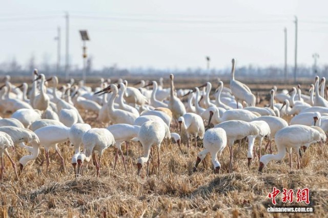 图为众多候鸟在田野中觅食。中新社记者 刘力鑫 摄