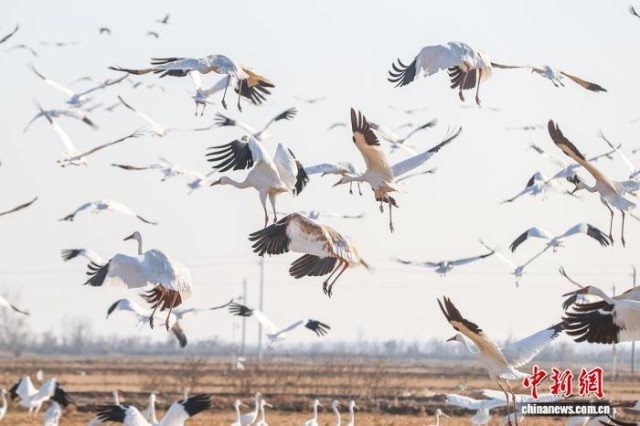 1月7日,江西上饶余干县,白鹤、白枕鹤、豆雁?等候鸟聚集在鄱阳湖畔的康山垦殖场插旗洲分场越冬。鄱阳湖是中国最大淡水湖,也是全球候鸟重要栖息地、国际重要湿地。作为亚洲最大的候鸟越冬地,每年有数十万只候鸟来到鄱阳湖越冬,其中包括白鹤、白枕鹤、东方白鹳等珍稀候鸟。图为众多候鸟从天空中飞过。中新社记者 刘力鑫 摄