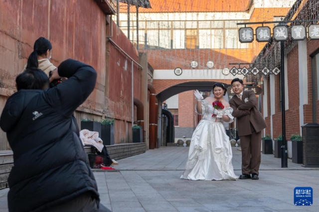 1月7日,一对新人在湖北省荆州市沙市洋码头文创园拍摄婚纱照。