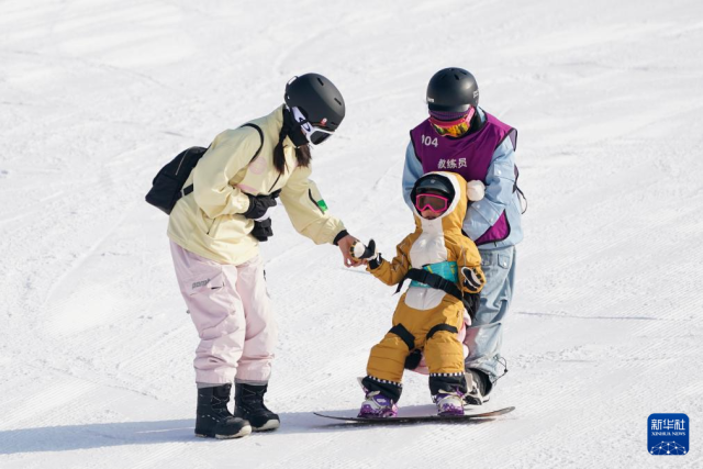 在广武国际滑雪场,一名小朋友在家长和教练的指导下练习滑雪(1月7日摄)。