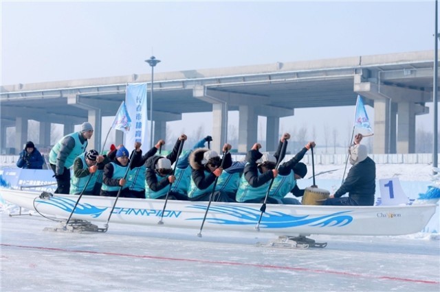 长春站比赛共设置12人冰上龙舟直道表演赛、5人小飞侠绕标赛、冰上龙舟拔河赛等项目。来自广东、湖南、内蒙古、河北、云南、天津等地的多支代表队齐聚于此,其中六支队伍尤为引人瞩目:从岭南北上挑战冰雪的广东踏浪龙舟队、平均年龄仅35岁的湖南长沙市龙舟协会龙舟队、源自“十四冬”的实力劲旅内蒙古辽阔草原锡林郭勒龙舟队、体系完备的河北279龙舟队、多民族大学生组成的云南民族大学龙舟队以及教体融合成果显著的天津体育学院龙舟队。他们的参与,生动诠释了“北冰南展”的全国性冰雪运动推广格局。