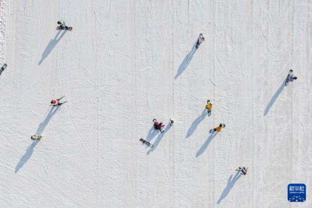 人们在呼和浩特马鬃山滑雪场滑雪(2025年12月14日摄,无人机照片)。