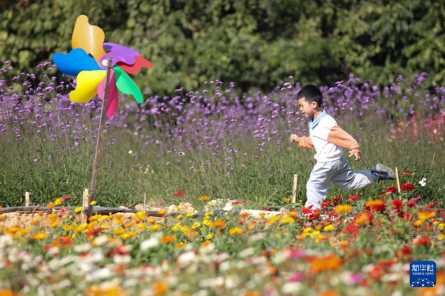 1月11日,小朋友在云南省景洪市工业园区管委会曼沙村的花海里奔跑玩耍。
