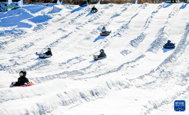 1月11日,游客在河北省唐山市迁西县凤凰山景区冰雪乐园坐雪圈滑雪。