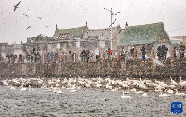 1月10日,在山东省荣成市俚岛镇烟墩角村,游客冒雪观赏大天鹅。
