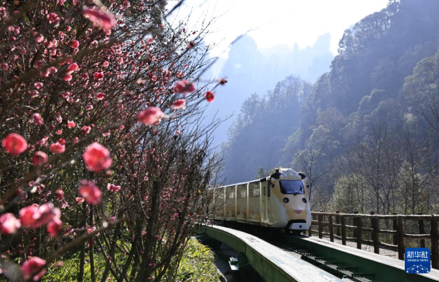 1月11日,观光电车行驶在梅花盛开的湖南张家界国家森林公园。