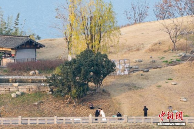 1月15日,一对新人在重庆巫山宁江渡生态公园拍摄婚纱照。中新社记者 何蓬磊 摄