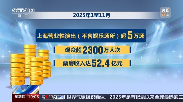 据统计,2025年1—11月,上海营业性演出超5万场、观众超2300万人次、票房收入达52.4亿元。今年,位于世博文化公园的上海大歌剧院即将交付使用;上海将继续举办各类大型电影节、演唱会、艺术展览和体育比赛,以文促旅,推动消费市场提质扩容。