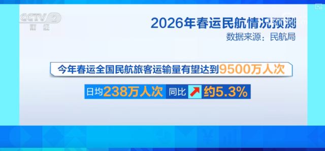 春运期间,返乡流、探亲流、学生流与旺盛的旅游度假客流相互叠加,航空出行需求将进一步释放。据预测,2026年春运,全国民航旅客运输量有望达到9500万人次,日均238万人次,同比增长约5.3%。