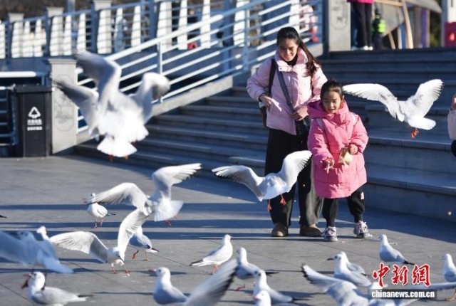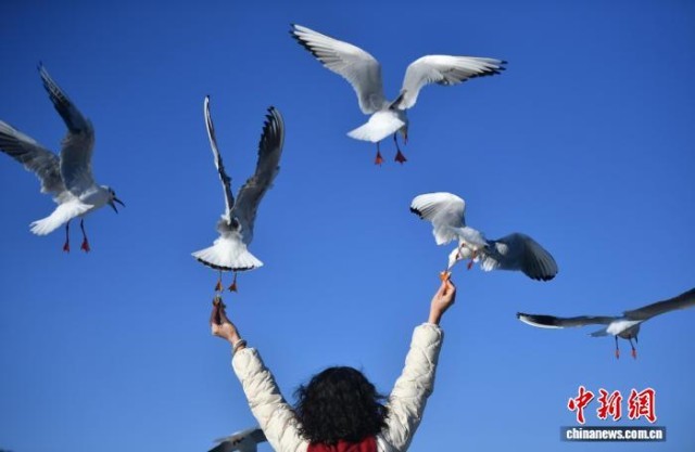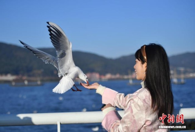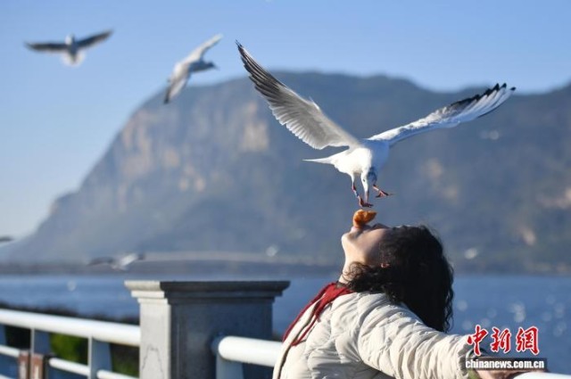 1月25日,游客与红嘴鸥互动。当日,云南昆明阳光和煦,众多游客在海埂大坝观鸥、喂鸥。海埂大坝可远眺西山、近览滇池,是云南冬季热门观鸥地,高峰期日游客量逾10万人次。中新社记者 黄兴鸿 摄