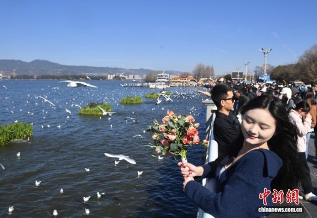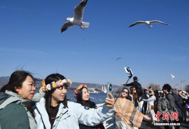 1月25日,游客争相打卡。当日,云南昆明阳光和煦,众多游客在海埂大坝观鸥、喂鸥。海埂大坝可远眺西山、近览滇池,是云南冬季热门观鸥地,高峰期日游客量逾10万人次。中新社记者 黄兴鸿 摄