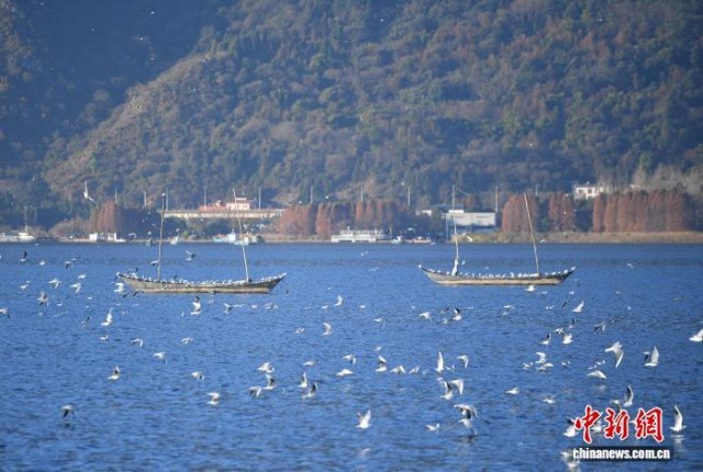 1月25日,一群红嘴鸥在滇池嬉戏。当日,云南昆明阳光和煦,众多游客在海埂大坝观鸥、喂鸥。海埂大坝可远眺西山、近览滇池,是云南冬季热门观鸥地,高峰期日游客量逾10万人次。中新社记者 黄兴鸿 摄