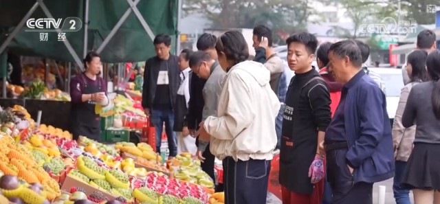 在海口的南北水果市场,各地的商贩和顾客穿梭其中,零售摊位与批发档口前人头攒动。摊位上,节日热门的车厘子、榴莲与海南本土的鸡蛋果、莲雾等都摆放整齐、琳琅满目。不仅是本地人购买,许多游客也专程前来挑选。
