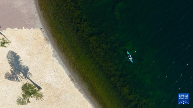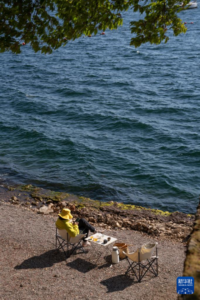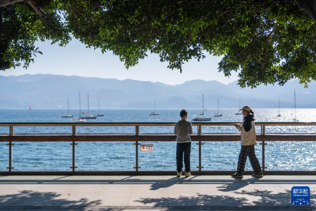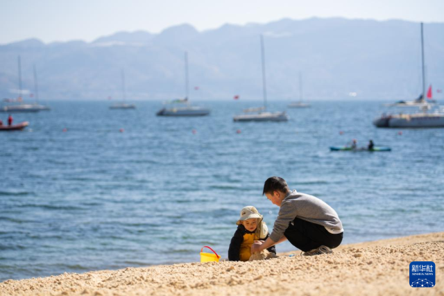 1月27日,游客在云南省玉溪市抚仙湖畔休闲。