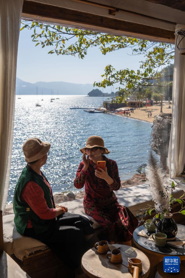 1月27日,游客在云南省玉溪市抚仙湖畔一家咖啡厅休闲。
