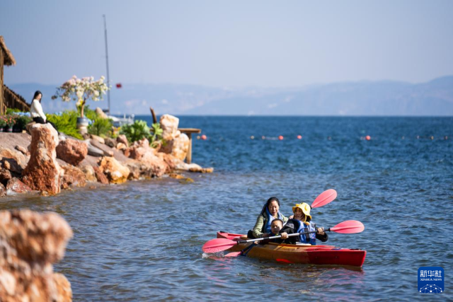 1月27日,游客在云南省玉溪市抚仙湖畔游玩。