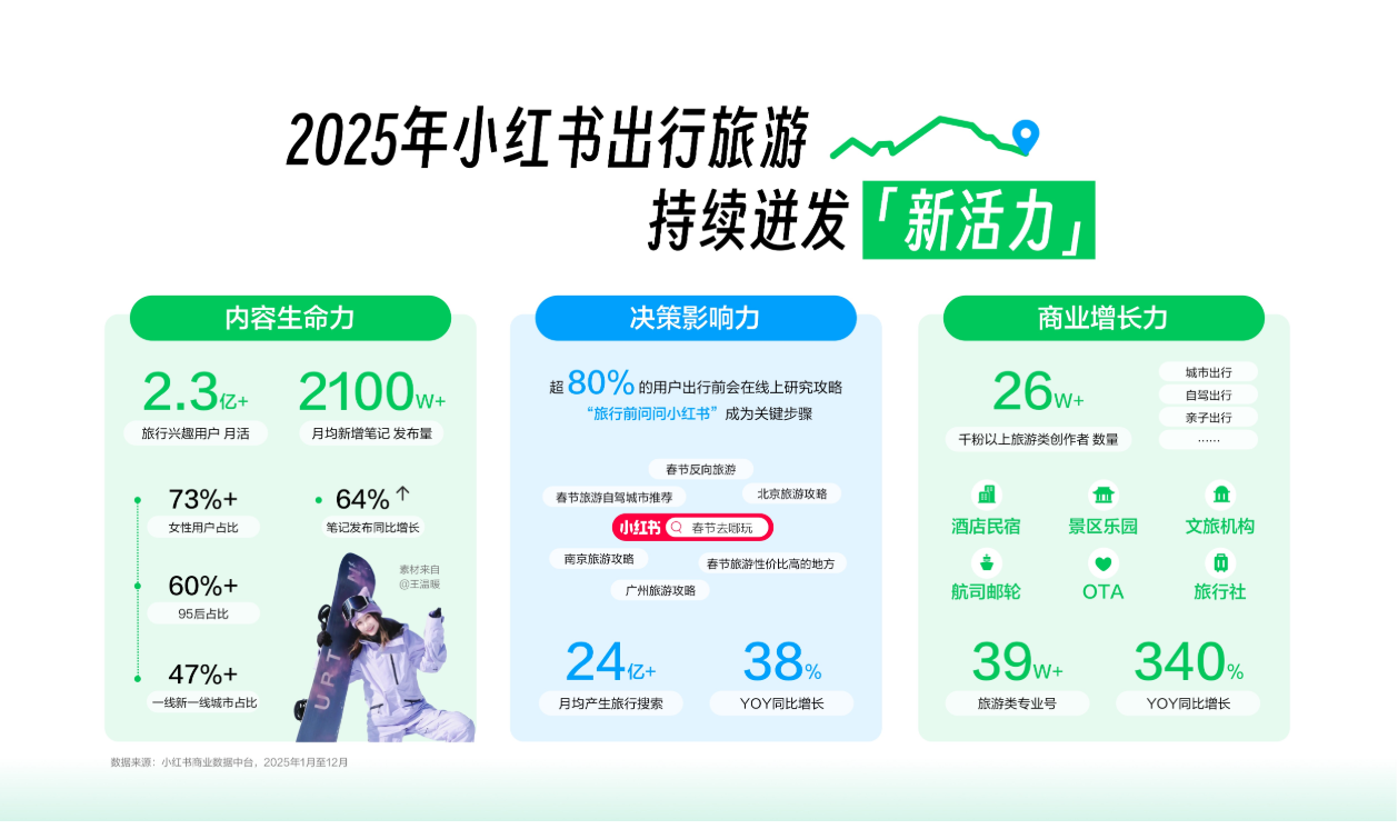 2025年,小红书在文旅行业的影响力进一步深化。数据显示,“旅行前问问小红书”已成为月均24亿+次的肌肉记忆,平台旅行兴趣月活用户超2.3亿,月均新增笔记发布量达2100万+。(数据来源:小红书商业数据中台,2025年1月至12月)