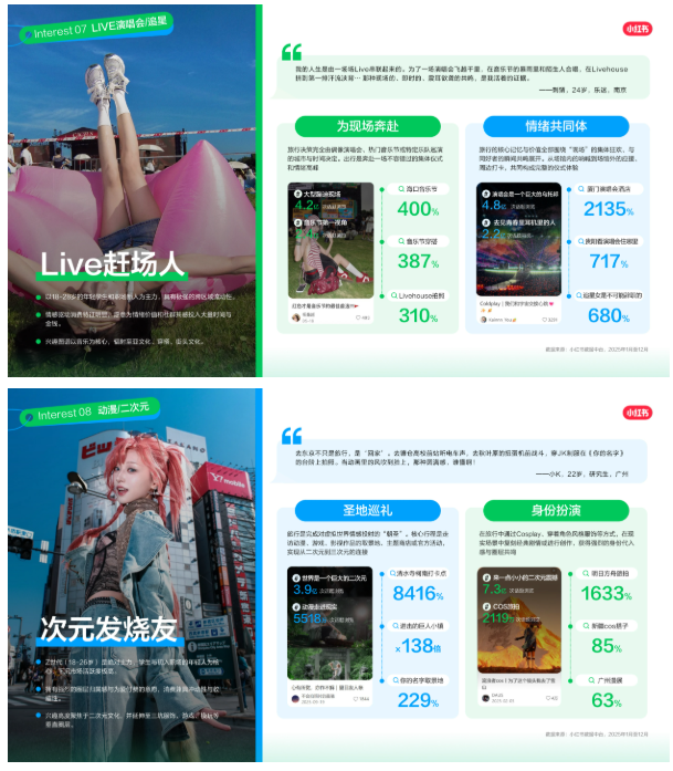 ? 风味当地人与市集淘金客:追求地道烟火气与独特物件,愿意为深度体验买单。 ? 玩学亲子家:注重寓教于乐,偏好博物馆与自然研学,追求高质量陪伴。 ? Live赶场人与次元发烧友:极具爆发力的为爱奔赴人群,演出与圣地巡礼是其核心驱动力。 ? 此外,还有追求避世办公的数字游牧民、注重审美体验的艺展收藏家以及追求视觉表达的出片特种兵。