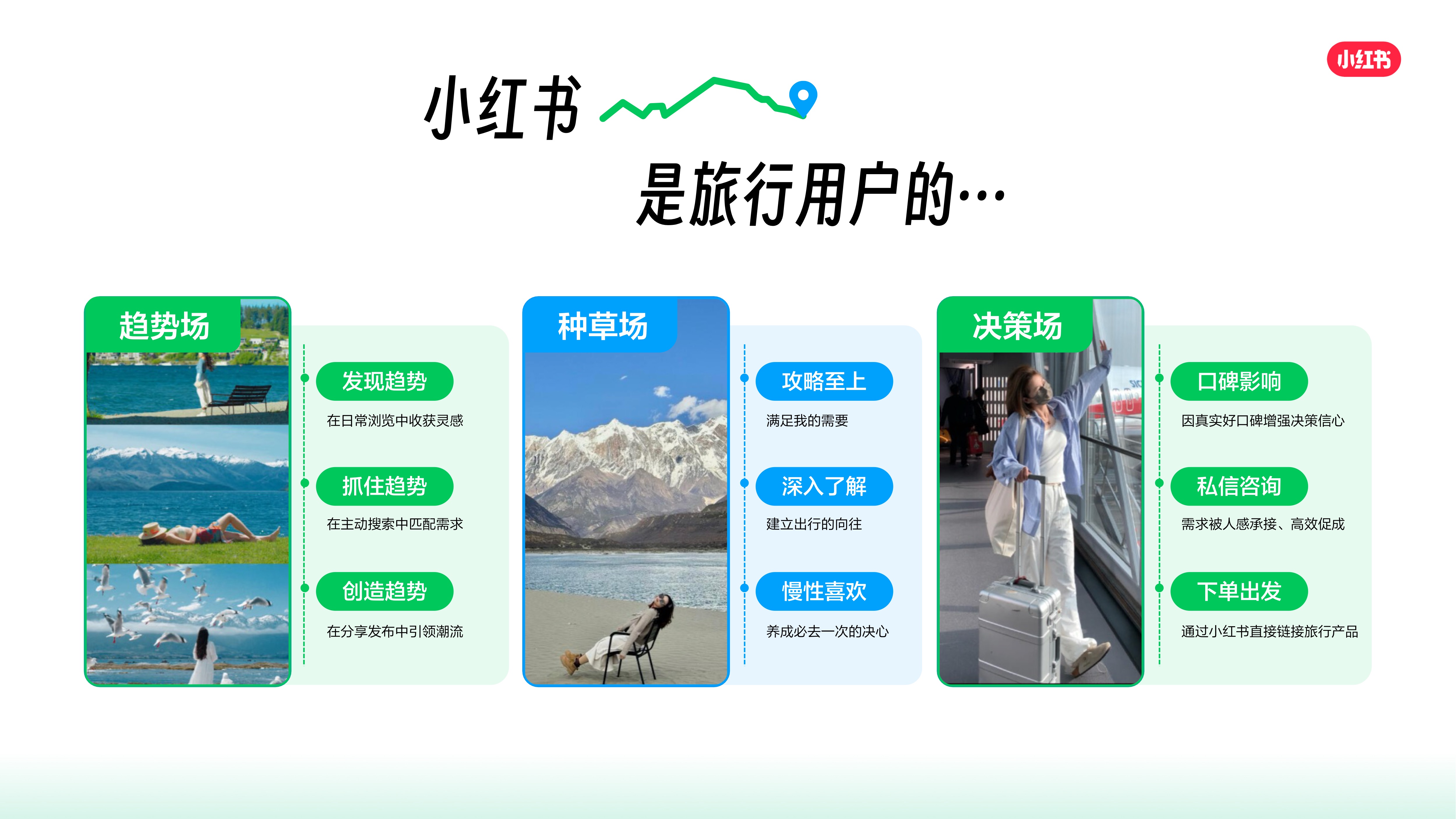小红书已从灵感与种草平台,进化为集趋势发现、决策影响与交易转化于一体的文旅经营阵地。通过人群洞察、兴趣切入、内容种草、搜索与转化承接,品牌能够实现从心智占领到生意增长,再到口碑沉淀的完整闭环。