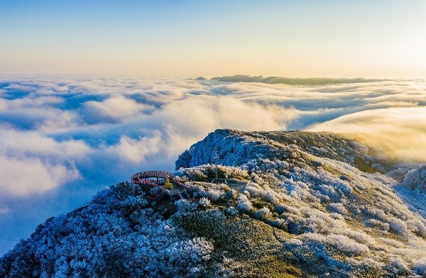 金佛山的冰雪盛景,满足了南方孩子对雪的向往,特别是今冬首次对外开放的金佛顶游线,打造了赏雪与祈福相融合的特色游览体验。在海拔2238米的雪山之巅,沉浸式观赏“巍峨雪山、翻腾云海、晶莹雾凇”三大自然奇观,还可通过系祈福带、挂祈福牌等互动形式,于新春来临之际许下金榜题名、前程似锦等美好愿景,实现饱览冰雪美景与参与祈福活动的双重体验。