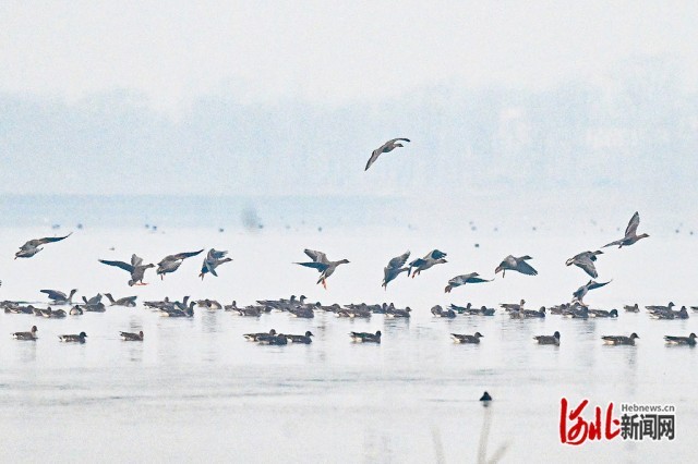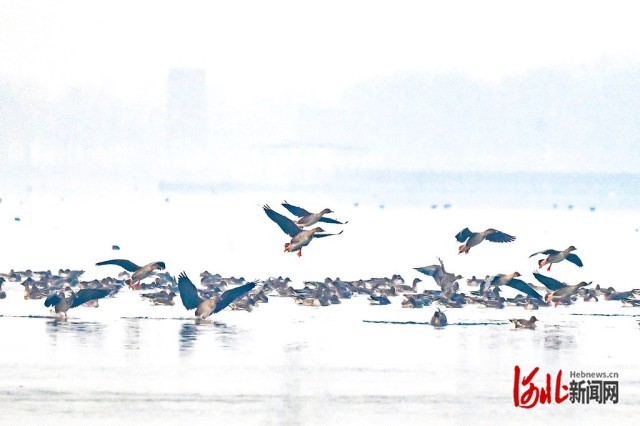 1月23日,大雁在磁县溢泉湖湿地栖息。
