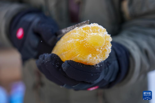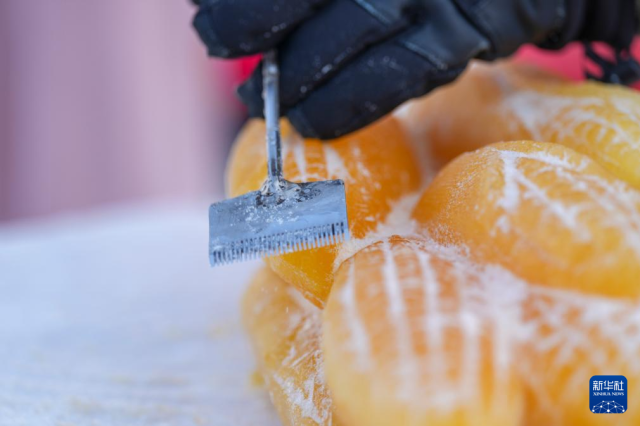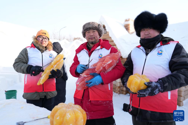 1月28日,第二十七届哈尔滨冰雪大世界的冰雕师使用植物彩色冰进行雕刻创作,为冰雕艺术带来崭新的视觉体验。