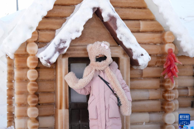 1月28日,参观者在第二十七届哈尔滨冰雪大世界园区中的植物彩色冰雕房屋前拍照。