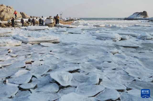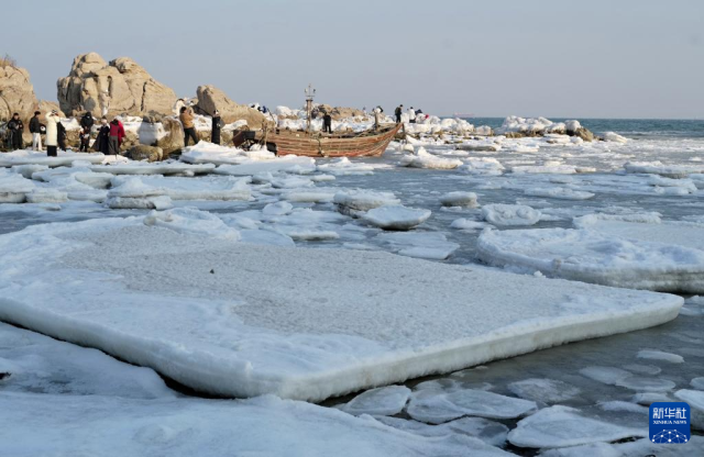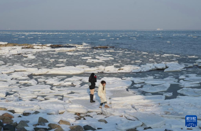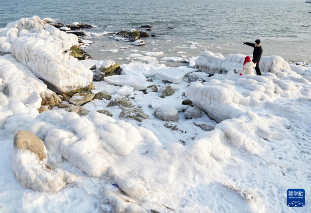 冬日里,河北省秦皇岛市海岸线出现结冰现象,吸引诸多游客前来观赏。