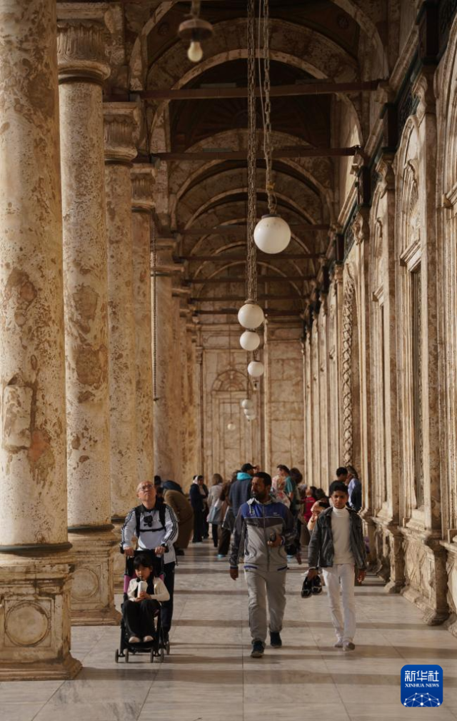 1月30日,游客在埃及开罗萨拉丁城堡内的穆罕默德·阿里清真寺前游览、合影。