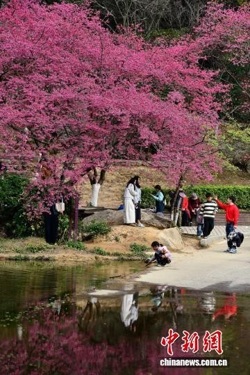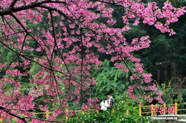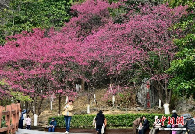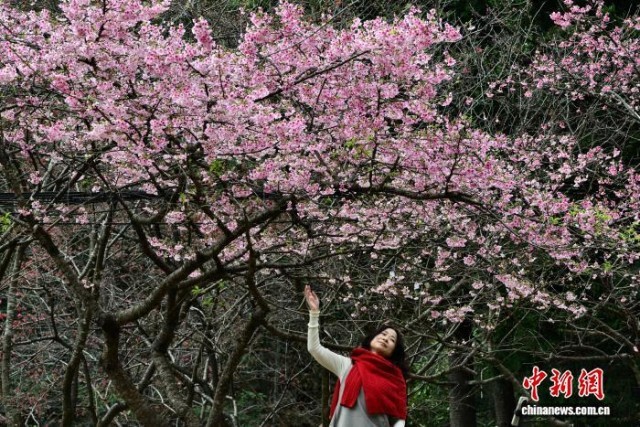 2月3日,福州植物园樱花园里樱花盛开,景色如画,吸引众多市民游客前来观赏。中新社记者 张斌 摄