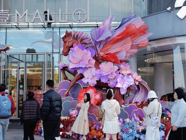 在昆明市中心的一家购物中心外,以“宋锦”为设计灵感的“贵马踏春”艺术装置吸引了众多市民游客拍照打卡。该装置将20余种宋锦布料经手工精心剪裁、粘贴,塑造成昂扬挺立的骏马形象,并在旁边设置了近5米高的桂花树,构成“马踏花枝”的图景,蕴藏着春日生机、彰显浓浓的年味。