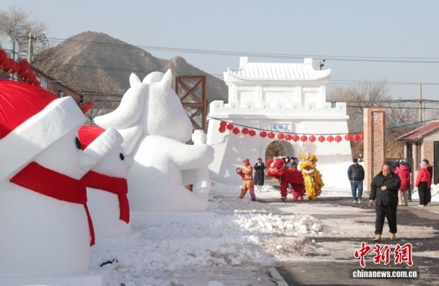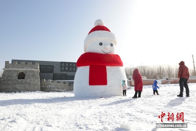 2月10日农历腊月二十三,中国北方小年,小朋友在北京市延庆区石峡关谷游客服务中心的大雪人和长城雕塑前玩耍。当日,“石峡关谷冰雪大庙会”启幕,吸引游客来此过小年。石峡关谷位于八达岭长城脚下,以石峡关长城为核心景观。