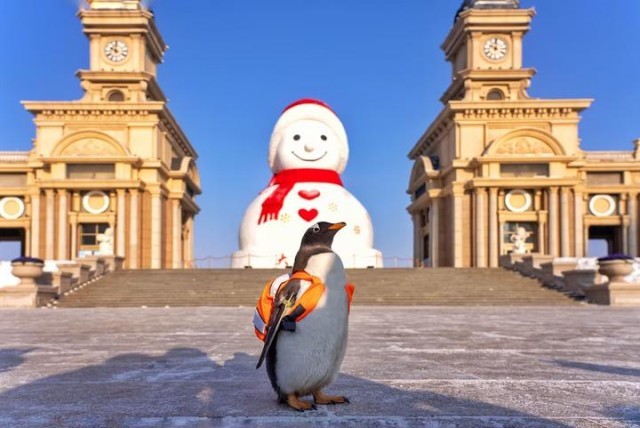 “淘学企鹅”“打卡”哈尔滨音乐广场。新华社发