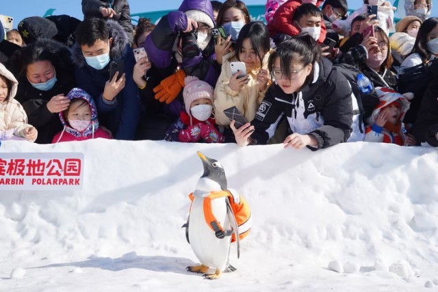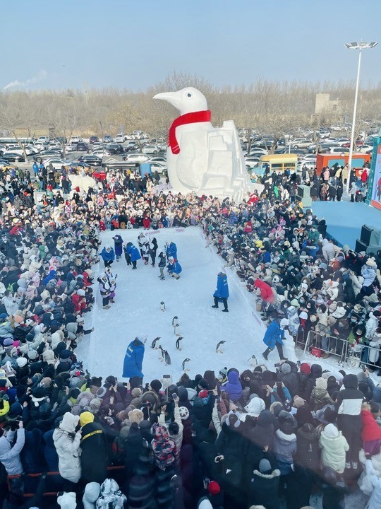 哈尔滨极地公园“淘学企鹅”表演吸引众多游客。新华社发