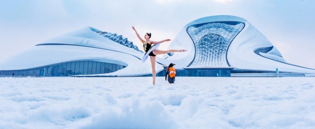 “淘学企鹅”在哈尔滨大剧院与芭蕾舞演员同框。新华社发