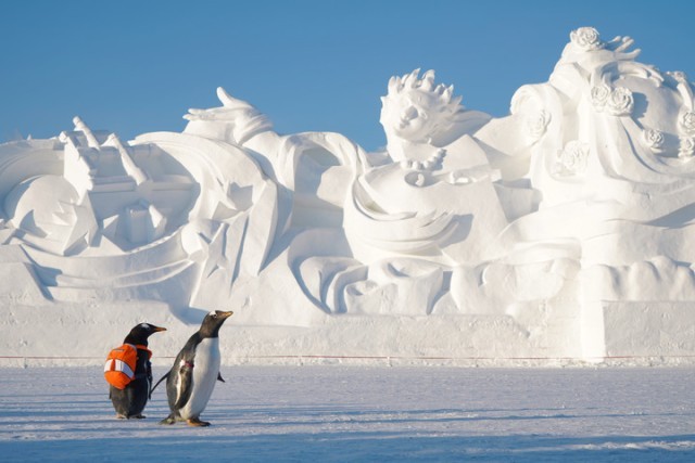 “淘学企鹅”“打卡”太阳岛雪博会。新华社发