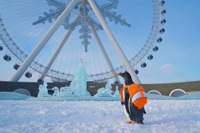 “淘学企鹅”“打卡”哈尔滨冰雪大世界。新华社发